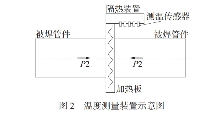 試驗所用焊接裝置采用自主設計的手動 PE管道熱(rè)熔焊接機,其試驗裝置如圖 1 所示,可實現焊接過程中加(jiā)熱溫度、焊接位移、焊接壓力等參數信息的實時顯示。設備通(tōng)過曲柄滑塊機(jī)構傳遞焊接過程所需壓力,壓力傳(chuán)感器 1 安裝在夾持導向裝置(zhì)上,監測焊接過程所施壓力;壓(yā)力傳感器 2 安裝在加熱板水平兩端,可對(duì)加熱壓力進行顯示;位移測量(liàng)裝(zhuāng)置與夾具連接,根(gēn)據夾具移動量可獲取管道在對接(jiē)時擠出的熔融層厚度;溫度測量裝置安(ān)裝在加熱板頂部,實時監測管道焊接區域(yù)的溫度。紅外(wài)探頭(tóu)采用交錯(cuò)式布置,點位分布如圖 2 所示,探頭沿軸向分別為距(jù)離加熱板端麵 8.2,10.2,12.2,24.2,35.2 mm。