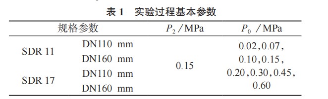 焊接試驗(yàn)環境控(kòng)製室內溫度(dù)為 27℃,空氣無(wú)流動(dòng),選取焊接工藝溫度為 215℃。根據 HG/T 4281–2011 塑料焊接工藝規程製(zhì)備熱熔焊接接頭。接頭性(xìng)能對溶(róng)膠(jiāo)壓力要求不高 [9–10],根據試驗所用手動式焊接裝置施壓機構的(de)自鎖特點,施加(jiā)一定溶膠壓力後,材料受熱熔化擠出,但夾(jiá)具不(bú)因壓(yā)力的變(biàn)化(huà)而移動(dòng),設備自行(háng)泄壓,可實現處理端麵不平整目的,使熔(róng)化的塑料在微弱壓力下充分流動。因此試驗省去加熱階段人為泄壓(yā)一環,對各規格管(guǎn)道施加相(xiàng)同溶膠壓力,采(cǎi)用材料熔化泄壓的方式對管道進行加熱。再通過(guò)改變焊件對接時的焊接壓力,保證其餘工藝參數不變的條件下進行試驗,利用(yòng)位移測量裝置(zhì)獲取管道在對接時擠出的(de)熔融段長度,得出不同焊接壓力下,熔融層的擠出厚度值 ( 即焊接位移值 )。相關參數設置見表 1,表中溶膠(jiāo)壓力(P2)與焊接壓力(lì)(P0)均為焊件截麵壓強。
