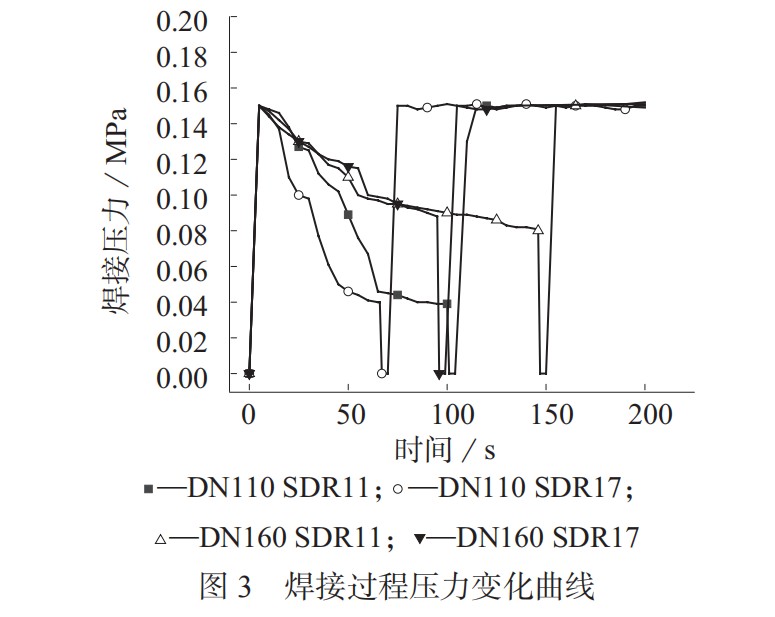 4 種規格管道按推薦壓力值 (0.15 MPa) 進行(háng)試驗,管道焊(hàn)接端麵壓力變化曲線如(rú)圖 3 所(suǒ)示。截(jié)取焊接過程前 200 s 數據示出。在(zài)加熱階段施加相同加熱壓力後,管道受熱熔化進行自主泄(xiè)壓;隨加熱時間的增加,不同規格的管道在泄壓速(sù)率上呈現出了明顯的差異,表(biǎo)現為管徑越大(dà),泄壓速率越高;加熱階段後(hòu)期,4 種管道(dào)泄壓速率均出現(xiàn)放緩,形成相對平衡的態勢,表明此時熔融(róng)物的(de)擠出量已(yǐ)逐漸趨於零,端麵進(jìn)行充分吸(xī)熱;加熱結束後,管道進入壓焊階(jiē)段,並(bìng)在焊接壓力作用下逐漸冷卻至室溫,焊縫以重結晶的方式結束整個焊接過程(chéng)。