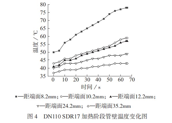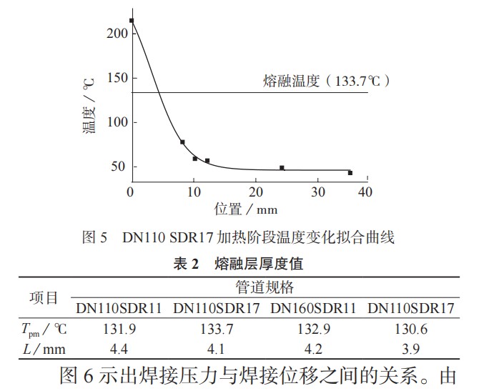 通過溫度測量裝置,測得加熱階段各場點的溫度實時變化過程。圖 4 為加熱階段管壁(bì)溫度變化圖。對加熱結束時的(de)場點溫度進(jìn)行數據擬合,結果(guǒ)如圖 5 所(suǒ)示,管道不同(tóng)場點溫度在加熱階段呈現出近似線性增長的趨勢。研究過程中利用德國耐馳公司(sī)生(shēng)產的 DSC200F3 型分析儀對試驗材料進行了差示掃描量熱 (DSC) 法試驗,獲取了材料確切的物理性能。測試條件為:樣品 (6.4±0.1) mg ;升溫速度10℃/min ;氮氣流(liú)量 50 mL/min ;加熱溫度 20~300℃。結合 4 種管材溫度場和 DSC 試驗結(jié)果,以熔融溫度 (Tpm) 為界限,得(dé)出熔融層厚度值 (L),見表 2。因管道屬性不同,各管道實際 L 也有所(suǒ)不同,進一步證明傳(chuán)統工(gōng)藝下的接頭焊接質量,受客觀因素影響較(jiào)大,環境或者(zhě)材料屬性的變化,可能導致管件 L 無法達到熱熔對接的要求。