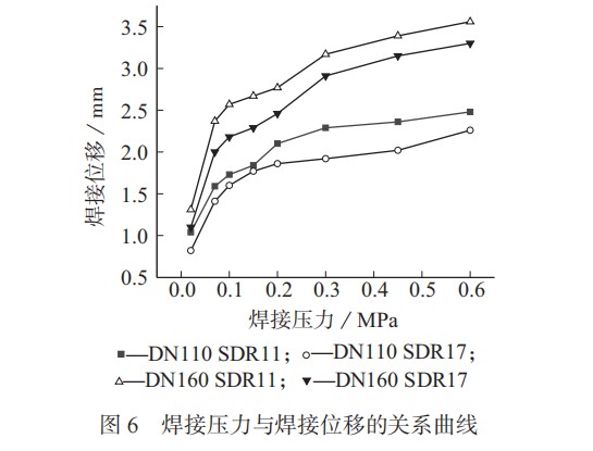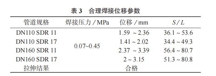 (2) 焊接壓力在 0.07~0.45 MPa 區間內進行熱熔(róng)焊接可製得合格的焊接頭,各規格管道在相同焊接壓力下所對應的焊接位移量不同(tóng)。當 S 一定時,通過控製位移參數,達到一(yī)定範圍(wéi)內的 S/L 值,可得到合格的(de)管道熱熔焊接頭。