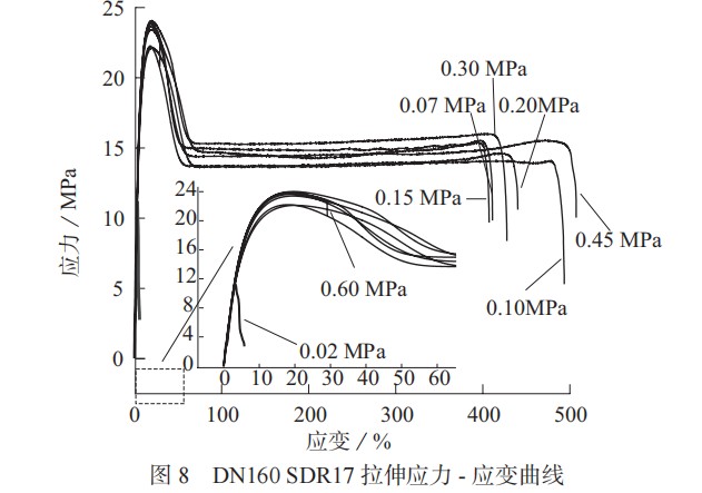 主要考察試(shì)樣拉伸強度、斷裂伸長率、斷口位(wèi)置(zhì)及(jí)斷裂方(fāng)式,以此作為評價熱熔焊接試驗接頭性能的依據。以 DN160 SDR17 為例,不同焊接壓力下的拉伸(shēn)應力 – 應變曲線見圖 8。通過 4 種規格管材在(zài)拉伸試(shì)驗結果對比分析,整體上可(kě)將各試樣拉伸應力 - 應變曲(qǔ)線(xiàn)分為 3 種形式,以下分(fèn)別分析。