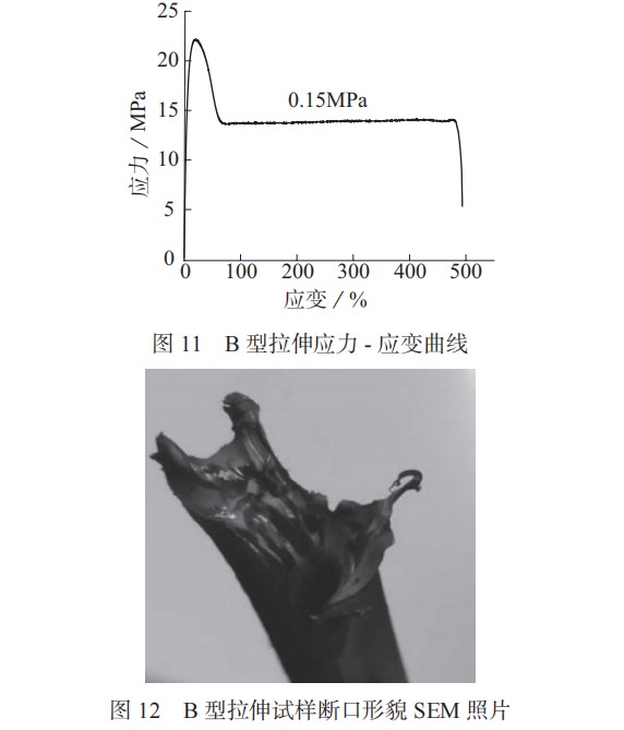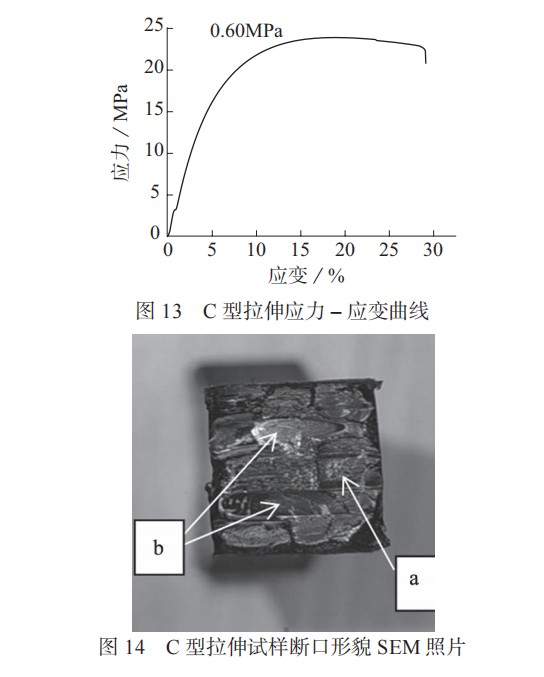 第三種 C 型拉伸應力 – 應變曲線如圖(tú) 13 所示。主(zhǔ)要存在於焊接壓力過大的管道焊(hàn)接接頭。管(guǎn)道在焊接壓力(lì)為 0.60 MPa 下的接頭試樣拉伸試驗結果。試樣斷口形貌(mào)的 SEM 照片如圖 14 所示。斷麵宏觀(guān)上呈現大麵(miàn)積白色銀紋區域 ( 圖 14 中 a 區域 ),中部光(guāng)滑區域 ( 圖 14 中 b 區域(yù) ) 出(chū)現解理斷裂現象,此現(xiàn)象為典型的脆斷特征。在此工況下出現拉(lā)伸脆斷原因:過高的焊接壓力致使(shǐ)接頭處溶膠被大量擠(jǐ)出,剩餘焊(hàn)接麵熔(róng)融物不足以滿足強度要求,加之管道熔融冷卻過程(chéng)等同(tóng)於對管材進行了退火處理,使熔(róng)融區內晶粒進行再結晶,提高管材結晶度,同時導致韌性下(xià)降,因此(cǐ)當拉伸應力(lì)到一定程(chéng)度後,試樣在尚未表現出明顯形變的情況下,在焊縫處直接脆斷。