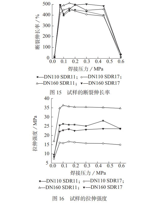 以圖 15、圖 16 示出。從圖(tú)中(zhōng)所示數據以及對試驗過程的觀察發現,焊接壓力在 0.07~0.45 MPa 內的試樣,其斷裂伸長率(lǜ)基本達到 400% 以上,斷裂形式(shì)為基材拉伸 – 基材斷裂,斷(duàn)裂方(fāng)式為韌性斷裂。
